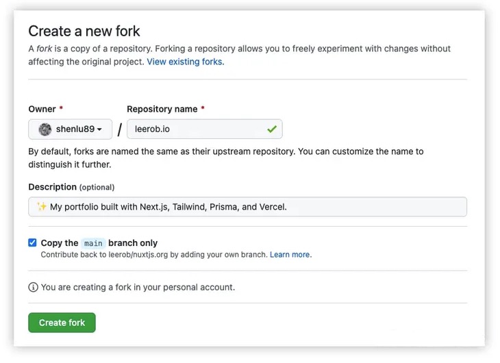 再点击 Create fork 按钮,创建派生项目到自己的工作区。
