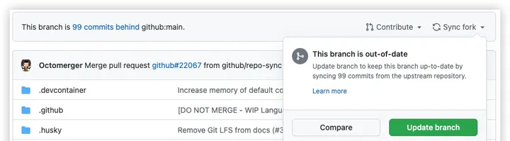 这步需要注意一下,有些项目更新的会比较频繁。当你做出修改和提交 PR 之前,可能有作者新的提交和 PR 被合并到原项目。如果有这种情况发生,在你工作区的派生项目会显示原项目有更新。例如: