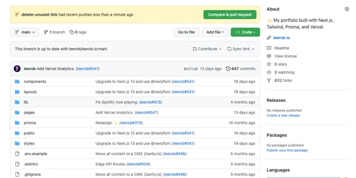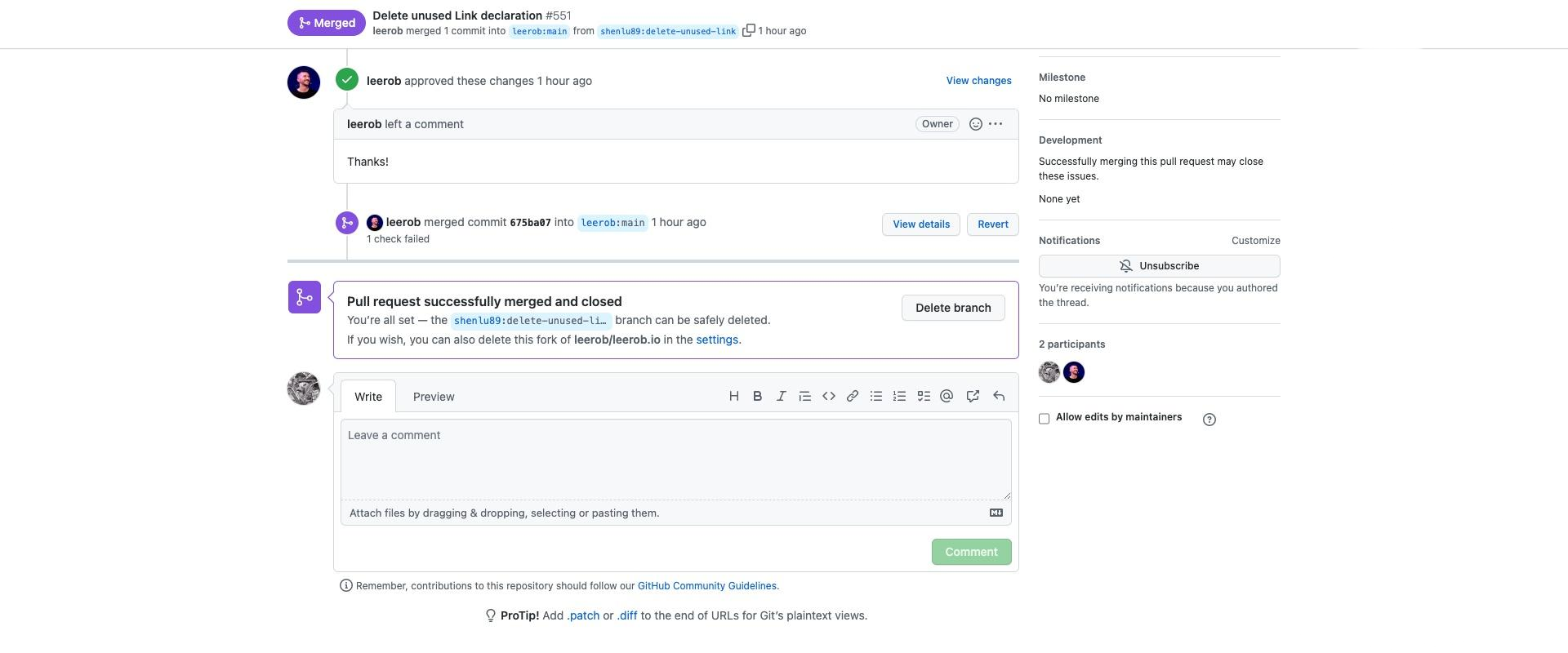来到原项目 Github 主页,找到之前已经合并的提交请求(在关闭的 PR 列表中),点击 Delete branch